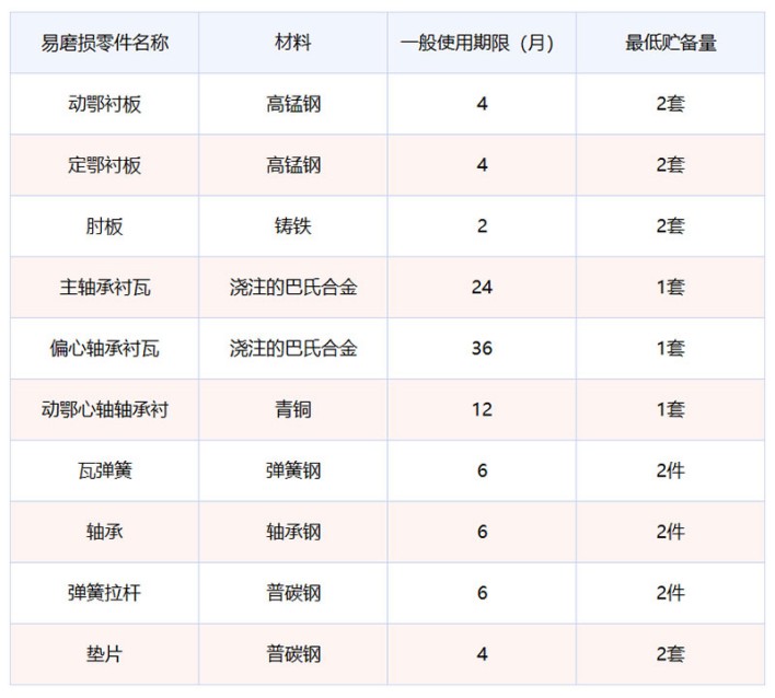 顎式碎石機(jī)的易損件使用壽命是眾多客戶都十分關(guān)心的,紅星廠家以用戶需求為生產(chǎn)起點(diǎn),以品質(zhì)為追求,在顎破設(shè)備的制造上下足功夫,動(dòng)鄂襯板、定鄂襯板均采用耐磨損的高錳鋼,主軸承襯瓦、偏心軸承襯瓦采用澆注的巴氏合金,肘板采用鑄鐵材料……更多材質(zhì)及使用壽命請(qǐng)看下表,可供用戶進(jìn)行參考。(注:實(shí)際使用壽命以個(gè)人為準(zhǔn))