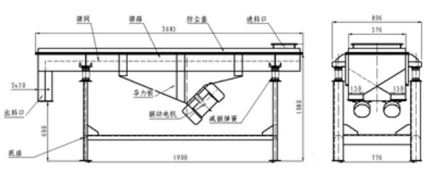 4、橡膠彈簧支承篩框,隔振吸聲,噪音低,設(shè)備動負荷小,不需混凝土基礎(chǔ)。
