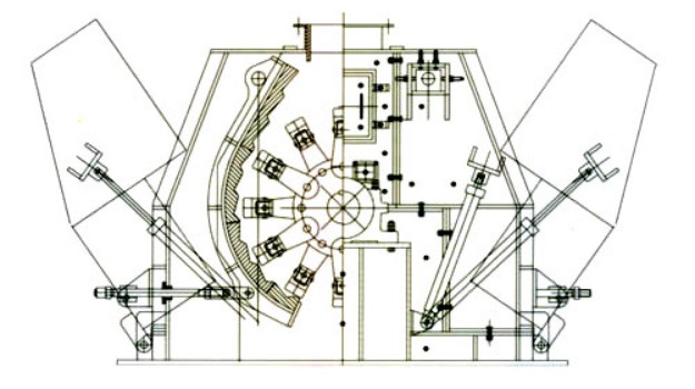 在PCXK可逆式防堵細碎機的中央布置有轉(zhuǎn)子,轉(zhuǎn)子帶動錘頭作高速圓周運動,對稱于轉(zhuǎn)子兩側(cè)有可調(diào)節(jié)的破碎齒板,破碎齒板可隨側(cè)蓋作開放性打開,特殊設(shè)計的齒板與錘頭的運動軌跡構(gòu)成破碎腔,從進料口處落下的物料,首先被高速旋轉(zhuǎn)的錘頭擊向破碎齒板,隨即又被齒板反彈向向錘頭或其它破碎齒面,物料在破碎腔中如此來回跳動,并在運動過程中相互碰撞,被進一步擊破,達到設(shè)計粒度的物料從破碎機底部的出料口排出。出料粒度可由調(diào)節(jié)機構(gòu)調(diào)整控制。