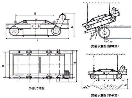 RCDC系列風(fēng)冷懸掛式電磁除鐵器的基礎(chǔ)上增加了驅(qū)動電機、滾筒、帶刮板的卸鐵膠帶等組成的卸鐵機構(gòu)。在工作過程中卸鐵機構(gòu)自動將卸鐵皮帶上吸附的鐵磁性物質(zhì)送到除鐵器以外的集鐵箱內(nèi),無需停電人工清理,實現(xiàn)了除鐵自動化。